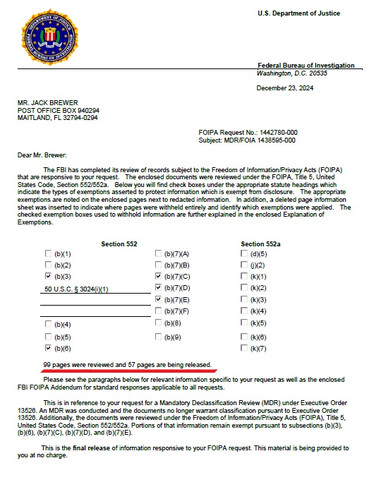 Soon after receiving FBI records in 2019, this writer submitted a request for a Mandatory Declassification Review, or MDR, in the hopes some of the withheld material would be further released. The Bureau issued a final response last week to the MDR, pictured below. While an initial page-by-page comparison revealed no newly released information (not so much as one single less redaction), some potentially interesting circumstances may nonetheless be discerned.