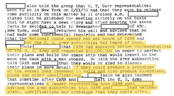 FBI records show that following Carr's presentation to the Army, at least one source indicated Uncle Sam would further entertain a proposal if Carr and company could produce blueprints, plans and other specifications. They could not produce such details but that did not stop them from setting a date in 1959 to launch Aho to the moon from Frontier City, Oklahoma. Suffice it to say Aho remained earthbound.